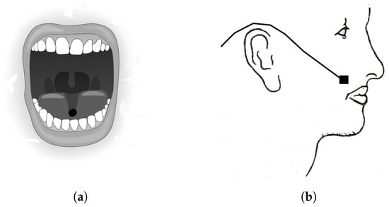 Prototype configuration: (a) Position of the magnet in the tongue; (b) Magnetic sensor close to the mouth.