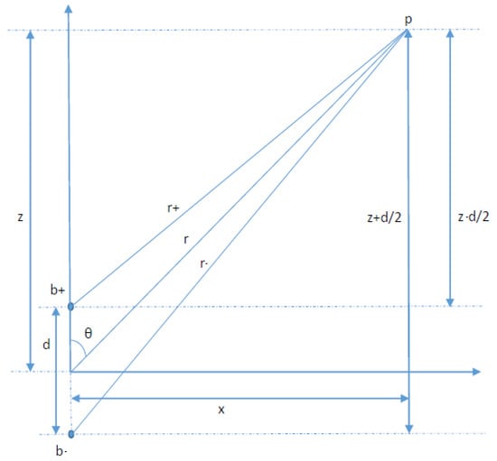 The magnet used in the tongue localization can be approximated by a magnetic dipole model [14,15]. We can assume that the magnet is composed of two charges, and , with a distance of d, so the module of the magnetic field is . These parameters can be calculated experimentally and it depends on the magnet characteristics. Figure 2 shows the magnetic field generated by the magnetic dipole in two dimensions in the position . It is composed of the contribution of charges and modulated by the distance r.