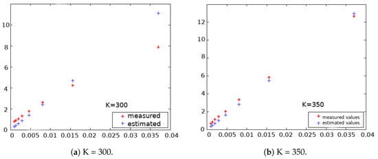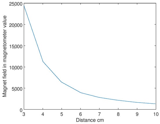 In Equation (6), is the constant of the magnet. k can be obtained by measuring in positions where , for the positions , and . Figure 3 shows a graphical plot of the magnet placed at different distances from the sensor. The x axis shows the distance as and the y axis the magnetic field value at that distance. Using these data, the magnetic constant k is measured for each magnet. The idea is to characterize each individual magnet for each specific sensor to obtain the magnet properties measured by each sensor and compensate for the possible sensor variances. This procedure is conducted for each sensor and for each magnet used by this sensor, obtaining an accurate measurement of the magnet for each unit of the sensor. The variances in sensor measurements due to the tolerances in the fabrication process are removed in this way and the final accuracy is improved.