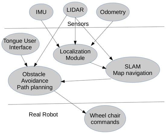 The wheelchair is programmed using the ROS system. The schematic of the modules is shown in Figure 8. It receives the desired destination from the user, and the wheelchair makes the decision to transport the user in a secure way to its destination. It is composed of a localization module, a SLAM (simultaneous localization and mapping module) or a pre-build map-based navigation module, and an obstacle avoidance and path planning module which generates the commands to apply to the wheelchair. The commands are received in this case from the magnet placed in the user’s tongue. This is converted to an ROS message that the rest of the system processes. The command indicates the movement direction, and all the systems apply this command in an intelligent way, avoiding obstacles or making decisions to achieve the final destination.