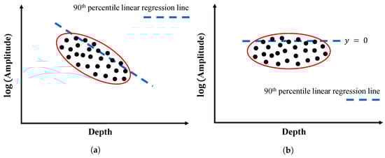 The current practice of depth-correction is to fit a 90th percentile linear regression line on the plot of GPR amplitude versus depth and obtain the attenuation rate to depth [1,8] due to geometric spreading and dielectric loss in a relatively good concrete. A schematic of this process is depicted in Figure 1a. This line represents the amplitude–depth relationship of rebars that have the top 10% of amplitudes at various depths. All data points in Figure 1a are then corrected by the 90th percentile line by subtracting the fitting line equation at different depths. Graphically, this process is equivalent to rotating the plot counterclockwise until the 90th percentile line is horizontal, as shown in Figure 1b. With this method, the amplitudes of all rebars in concrete with the same conductivity are corrected to the same depth and they can be compared for signal attenuation with the effect of depth variation.