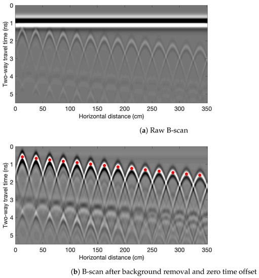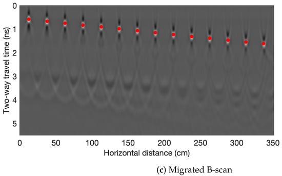 Data processing procedure for the simulated models is illustrated in Figure 2. Before extracting the rebar amplitudes and TWTTs from the raw B-scan image in Figure 2, we need to do zero time offset and background removal. Zero time offset shifts all signals upward so that the zero time represents the time when EM wave emits from the transmitter. Background removal eliminates the strong direct wave amplitude from the B-scan and enhances the contrast of the image. Figure 2b shows the same B-scan after background removal and zero time offset. In this step, TWTTs and the amplitudes at the apex of hyperbolas are extracted. Figure 2c shows the B-scan image after migration process with selected peak amplitudes. Migration focuses the rebar reflection energy spread in the hyperbolas to a single point.