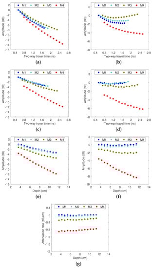 In Figure 3e, the migrated amplitudes with true velocities are plotted against the actual rebar depth. Figure 3f shows the depth-corrected amplitudes, where the amplitudes of M1 and M2 are corrected to 0 dB for all rebars, and M3 can be clearly differentiated from M1 and M2. Model M4 shows very large attenuation and the amplitude decreases with rebar depth. Therefore, the real depth-correction method can clearly distinguish areas in moderate and deteriorated concrete from sound concrete. However, the rebars in model 4 show decreasing amplitude with increasing depth, because the conductivity loss in severely deteriorated concrete cannot be fully corrected.