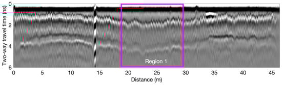 The bridge S075 17596 has three spans and carries two-way traffic. The concrete bridge deck has a length of 45 m (152 ft) and a width of 12 m (40 ft), with an asphalt overlay. In 1974, the bridge was reconstructed and two shoulders were added to existing lanes. NDT tests were performed during the deck repair period. GPR and Half-Cell Potential (HCP) data were collected on bare concrete along the southbound lane and shoulder after asphalt overlay removal. Based on GPR data, the rebar spacing is 12.5 cm in the traffic lane and 25 cm in the shoulder. A GSSI SIR-4000 GPR system with a 1.5 GHz ground-coupled antenna was used to scan the bridge in the longitudinal direction. In all GPR scans, the spatial resolution was set as 3 mm in the longitudinal direction and a line spacing of 30 cm (1 ft) in the transverse direction. According to National Bridge Inventory (NBI) data, at the time of data collection, the bridge deck condition was classified as Fair [18]. Figure 4 shows a GPR B-scan collected from this bridge at the transverse distance of 5 m, which passes through Region 1 highlighted in Figure 5e. In the middle span (15–30 m), the reflections of top rebars and bottom surface have larger TWTTs and lower amplitudes than the left and right spans, which indicates lower velocity and deterioration in this range.