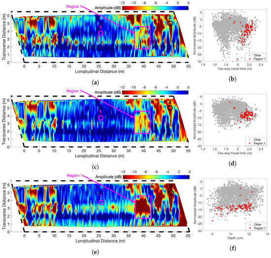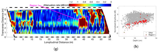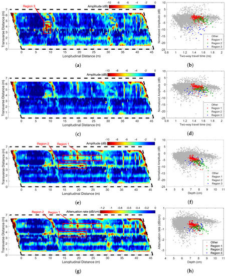 GPR data were analyzed using the methods discussed in Section 3. Figure 10 shows the GPR amplitude maps generated using the four depth-correction methods. For each map, the corresponding scatter plot of corrected amplitudes against the TWTT or depth is also given. The amplitude maps are similar by visual comparison which indicates that major deteriorated areas are identifiable with all depth-corrections methods. However, the amplitude ranges within possible deterioration areas are different. Region 1 is highlighted in all maps. For example, the amplitude range inside Region 1 is [0, −18] dB in Figure 10a, while the same region shows a limited range of [−5, −13] dB in Figure 10c, [−10, −18] dB in Figure 10e. The attenuation rate range for the same region is [−2.2, −0.86] dB/cm in Figure 10g. Compared to the depth- based correction methods and VEI map [17], the TWTT-based methods over correct the amplitudes and underestimate the deterioration in this region.
