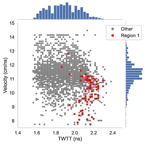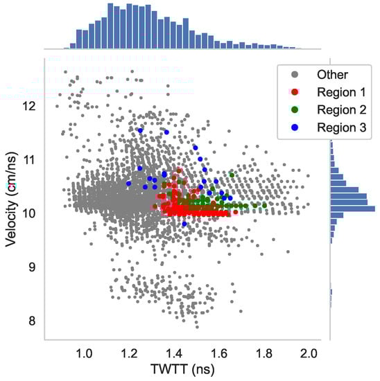 TWTT vs. velocity plot with marginal histogram (Bridge S077 05693R).
