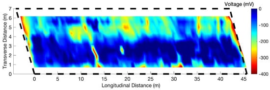 After asphalt overlay removal, Half-Cell Potential (HCP) data were collected on the concrete deck surface at a 60 cm × 60 cm (2 ft × 2 ft) grid for validation. The HCP-voltage map is shown in Figure 7. Compared to the GPR maps, the HPC map missed the horizontal low amplitude line at 3.8 m in the transverse direction because of the large grid spacing used in the HCP test. The low-voltage area at 5 m in the transverse direction between 15 m to 30 m in the longitudinal direction in the HCP map matches with Region 1 in Figure 5e,g.