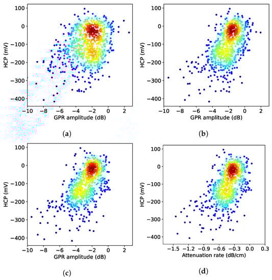Scatter plot of HCP data and three GPR depth-corrected amplitudes on Bridge S075 17596 using (a) TWTT-unmigrated amplitudes (CC = 0.347), (b) TWTT-migrated amplitudes (CC = 0.55), (c) depth-corrected amplitudes (CC = 0.63), and (d) attenuation rate with depth-corrected amplitude (CC = 0.57). Color represents data density, and red color indicates high density.