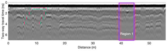 Bridge S077 05693R is 54.9 m (180.1 ft) long with two lanes carrying one-way traffic. The bridge deck has a concrete overlay, which leads to large cover thicknesses in range of 8–14 cm. According to NBI data, at the time of data collection, the bridge deck condition was classified as Fair [18]. Based on GPR data, the rebar spacing is 12.5 cm (5 in) in the traffic lane and 25 cm (10 in) in the shoulder. A GSSI SIR-4000 GPR system with a 1.5 GHz ground-coupled antenna was used to scan the bridge in the longitudinal direction. Due to time constraint at the time of testing, only the northbound lane and the adjacent shoulder of the bridge deck was tested. In all GPR scans, the spatial resolution was set as 3 mm in the longitudinal direction and a line spacing of 60 cm (2 ft) in the transverse direction. A GPR B-scan image collected at the transverse distance of 3.3 m is shown in Figure 9. A region with obvious deterioration is highlighted.