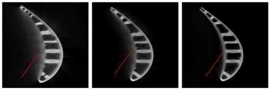 ICT images of turbine blades affected by different degrees of artifacts—the degree decreases from left to right. Severe artifacts have seriously affected the measurement of the wall thickness of blades in CT images.