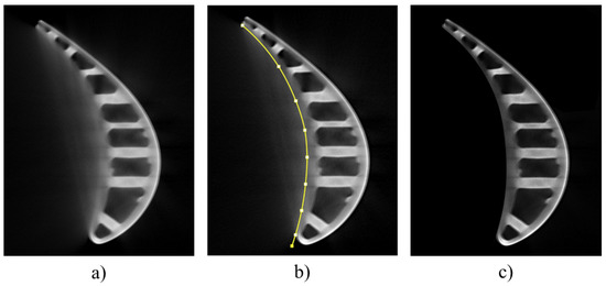 Figure 2 shows an example of creating a label without artifacts for a training sample. When manually preparing an ICT image (see Figure 2a) to remove artifacts, we fit the contour of the blade first (see Figure 2b) and then set the image outside the contour to zeros to remove artifacts (see Figure 2c).