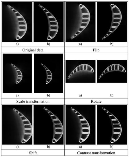 Figure 3 shows some examples of data augmentation, where we uniformly apply operations such as flipping, scale transformation, rotating, shifting, and contrast transformation to a training image and its corresponding label. Flipping, rotating, or shifting can simulate the flipping, rotating, or shifting of the target (i.e., blade) itself in the real scenarios; scaling can simulate the size change or forward and backward movement of the target in the real scenarios; and contrast transformation can simulate the different densities of the target in the real scenarios.