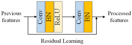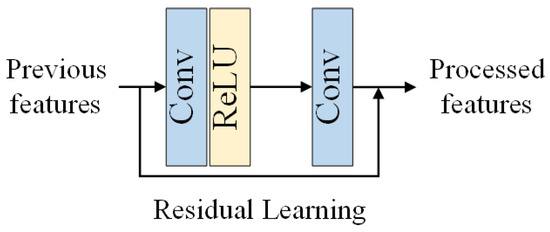 In order to achieve better performance, EDSR [27] proposes the Enhanced Residual Block (ERB, see Figure 4), which removes the Batch Normalization (BN) layers in the original Residual Block (RB, see Figure 5) in ResNet [28]. EDSR [27] found that (1) BN layers have been shown to improve the generalization performance of deep neural networks by normalizing the activations of each layer, which can reduce the internal covariate shift and help prevent overfitting. However, in the context of image restoration, the BN layers did not provide any significant benefits and even slightly degraded the performance of the network. (2) BN layers will introduce additional computational overhead, as they require additional forward and backward passes during training and inference. Removing the BN layers from the RB can reduce the number of operations required and make the network more efficient. (3) EDSR argued that the use of BN layers may not be necessary in the context of image restoration, as the network is able to learn the normalization of the activations on its own through the residual learning mechanism. The removal of BN layers in ERB was motivated by the desire to improve the performance and efficiency of the network for image restoration, without the need for additional normalization layers. We can also verify this conclusion in the results comparison of DnCNN and ERAR in Section 5.2.