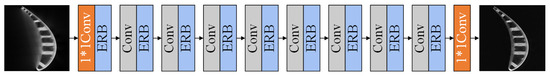 As shown in Figure 6, the proposed enhanced residual network for turbine blade ICT images artifact removal (ERAR) uses a Conv and an ERB to extract shallow features, eight convolutional layers followed by eight ERBs to extract hierarchical features, and a Conv to reconstruct the ICT images without artifacts.