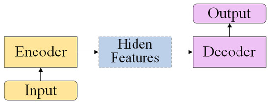 The Encoder–Decoder framework is a general deep learning framework, which is widely used in text translation [29,30], image generation [31,32], and image restoration [33,34]. The Encoder–Decoder model can be abstractly represented as Figure 7. Given the input, the encoder encodes the input nonlinear transformation into hidden features and then decodes the hidden features through the decoder to transform the hidden features into the target output. One advantage of the Encoder–Decoder framework in computer vision is that it allows the efficient processing of high-resolution images by reducing the dimensionality of the input data through the encoder portion of the network. This allows the network to run faster and with less computational resources. Another advantage is that the Encoder–Decoder framework allows for the generation of high-quality output images, as the decoder portion of the network is able to reconstruct the output image using the encoded representation of the input image. This is particularly useful for tasks such as image restoration (e.g., artifact removal), where the quality of the output image is important.