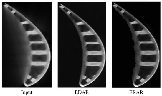 ERAR. Because the size of the convolution kernel used in ERAR is small and the step size is 1, the RF of the whole convolution network is small. According to calculation, the RF of ERAR is 35, so the model cannot capture the shape features in the image. It is challenging to recognize the specific area where the artifact occurs. In the feature extraction and processing of ERAR, the resolution of the feature map is always consistent with the input images, which ensures that the output image information will not be lost and the turbine blade in the image can remain clear.
