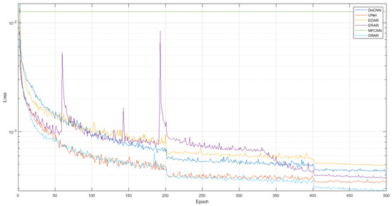 Loss value of DnCNN, ERAR, MFCNN, UNet, EDAR, and DRAR during training process.