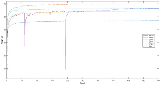 PSNR of DnCNN, ERAR, MFCNN, UNet, EDAR, and DRAR during training process.