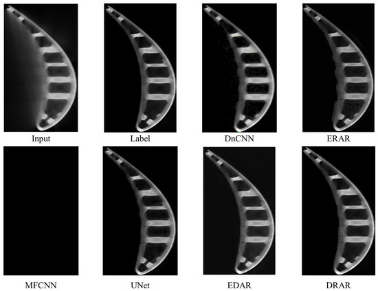 Visual results. In Figure 15, we compare the visual results generated by DnCNN, ERAR, MFCNN, UNet, EDAR, and DRAR, where MFCNN is unable to converge and the results of MFCNN are all zeros. Since DnCNN and ERAR keep the resolution unchanged during image processing, their results retain better image details. However, due to the smaller RF, ERAR cannot capture the shape features in the image and thus accurately judge the turbine area and artifact area in the image, so it cannot judge the contour of the turbine, resulting in a poor artifact removal effect. In contrast, UNet and EDAR are able to effectively remove artifacts; however, it can be seen from the generated blade images that the results become blurry and the details are lost in the process of removing artifacts. While DRAR has a larger RF and maintains spatial resolution, its processing results effectively remove artifacts, and the turbine in the image is precise and sharp. Such an obvious comparison proves that DRAR has a more robust ability to combine and represent features, which can produce sharper and more convincing results from LR images.