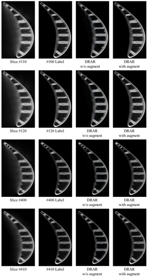 Table 3 shows the quantitative results of DRAR w/o augment and DRAR with augment. Due to the small number of samples (a total of only 640 images are used to prepare the dataset), the DRAR w/o augment overfits to the existing data. In other words, the DRAR w/o augment learns to memorize the location or direction where artifacts occur and directly treat this area as artifacts and remove them (this can be seen in rows 3 and 4 of Figure 16, where DRAR w/o augment incorrectly removes parts of the blade as artifacts in slices #400 and #410.). By data augmentation, the inherent symmetry of the ICT image is broken, but the number of images and the diversity of the dataset are increased; in addition, the location and direction where the artifacts occur are not fixed, which will force DRAR with augment to learn how to recognize the pattern of artifacts and achieve more accurate artifact removal.