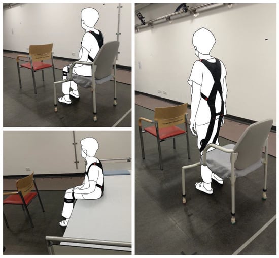 Strength and balance training is the recommended standard to improve the STS transfer in older persons [6,7]. It is also one aspect of fall prevention in frail older persons [8,9]. Using armrests and individually adapting the seat height and foot position are strategies to optimize the STS context [10], and should be part of physiotherapy and occupational therapy. External support could be provided by exoskeletons, which support older persons transferring from sitting to standing. Currently, lower-limb exoskeletons are available only for gait rehabilitation, but they are still in their early stages of development [11]. In contrast, exoskeletons for STS support are not available at all. Any technical support should take into account the mechanical and metabolic burden (i.e., weight) of the device [12] resulting in a trade-off between compliance and support. Exosuits are a specific type of exoskeleton without a hard rigid structure for power transmission. Although in exosuits the external support of the movement is limited, the weight is minimal and possible joint misalignment due to rigid material [13] is avoided. A passive assistive device based on elastic straps was developed to support knee extension [14], but not to support the total chain of body extension (knee, hip, trunk), which is necessary during the STS transfer. There are several exosuits available for industrial work, i.e., lifting heavy weights [15]. Since the STS transfer involves the same sequence of movements, such as forward trunk lean followed by leg and trunk extension, these products might be adapted to the needs of older persons to support and improve STS transfers. To quantify and evaluate the support of an exosuit during STS transfer, sensor technology could be used.