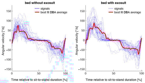 Single gyroscopic sensor signals adjusted to the same length by interpolation and best fit Dynamic Time Warping Barycenter Average (DBA) for sit-to-stand transfers from bed without and with using an exosuit. Time was standardized relative to the sit-to-stand duration.