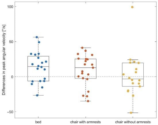 Boxplots and single measurements for differences in peak angular velocity between using an exosuit or not during sit-to-stand transfer from bed, chair with armrest support and chair without armrest support.