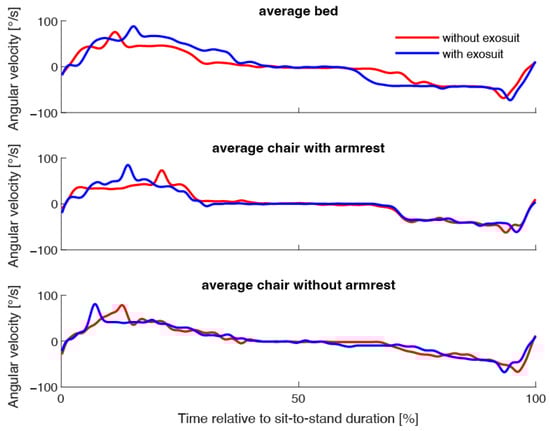 Two inertial measurement units (IMUs) (xSens DOT, xSens Technologies B.V., Enschede, The Netherlands) were fixed by Velcro straps at the front of the participants’ thighs. Angular velocity of the thighs was recorded by gyroscopes at 120 Hz. After lowpass filtering with a 3rd order Butterworth filter with a cut-off frequency of 6 Hz, mean PAV of the right and left thigh was calculated and used as the outcome parameter to describe STS performance [20]. After all measurements, the usability of the exosuit was assessed with the System Usability Score [22], a 10-question interview scoring 0 (worst) to 100 (best).
