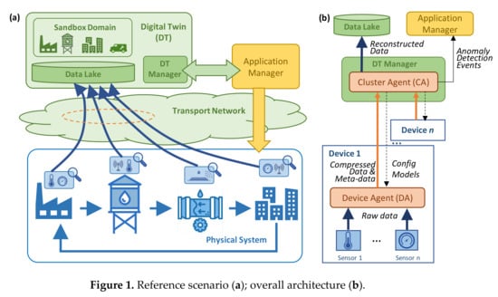 The reference scenario is sketched in Figure 1a, where a physical system contains a plethora of different sensors that generate heterogeneous telemetry data that need to be gathered and analyzed for several purposes such as smart autonomous operation. Although the example in Figure 1 sketches a water distribution system, the proposed architecture and algorithms are designed to fit with any smart system collecting time series telemetry data such as smart manufacturing and communication networks, just to mention a few. Without loss of generality, let us assume that the sensors generate data periodically, with a fixed time interval (that can be different among sensors). Therefore, every single sensor is a source of one or more time series telemetry data streams. All these data flows need to be transported from their sources to the centralized location where the DT is running. A typical DT architecture consists of three essential components: (i) a Data Lake, where the collected, pre-processed, and post-processed data are stored; (ii) the Sandbox Domain, containing the different models and algorithms that emulate the different components of the physical system; and (iii) the Digital Twin Manager (DTM) that is in charge of several actions including the management of the models in the sandbox domain. Moreover, the DTM interfaces with the Application Manager in charge of both the physical and DT systems. Note that the Application Manager uses the DT to analyze the current and future state of the physical system, which can be achieved by combining the collected data available in the Data Lake and the models and algorithms in the sandbox domain. The result of such analysis can lead to specific actions to be executed in the physical system. Moreover, the Application Manager can configure rules and policies to the DTM, so that the latter can perform tasks such as intelligent data aggregation and anomaly detection in an autonomous way.
