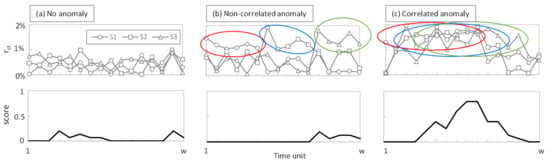 Example of the MS-AGD score: no (a), non-correlated (b), and correlated (c) anomaly.