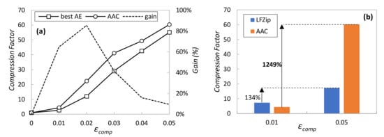 AAC benchmarking against the best single AE (a) and LFZIP (b) methods.