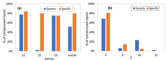 Finally, Figure 7b details how many times every AE in the pool is used, for both generic and specific AE pools. Results show the average performance for all DAs and εcomp = 0.01. Note that the smallest LS size is frequently selected; however, sometimes a smaller compression (larger LS) is needed to guarantee the target reconstruction error, which adds value to the proposed AAC method. Moreover, the use of larger AEs is reduced when specific AEs are trained. For this very reason, we can conclude that the use of generic AEs is useful to provide compression from the beginning of sensor operation but needs to be substituted by specific AEs to reach maximum performance.