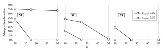 Figure 8 evaluates the percentage of false positives detected by each of the sensors as a function of different values of SS-AD parameters εanom and α (β was fixed to 100). A false positive is detected if SS-AD returns True during the period of normal operation, i.e., when no anomalies are introduced. In light of the results, we can conclude that increasing εanom to 0.10 is sufficient to reduce α to short values (25 for S1 and S2 and 10 for S3) that lead to zero false positive detections. Note that, the shorter α is, the faster the detection of true anomalies. Then, assuming the best configuration of parameters for every sensor, Table 3 shows the detection accuracy of all the aforementioned anomalies. It is worth noting that SS-AD achieves very high accuracy (>95%) for most of the considered anomalies. Indeed, only the S1 SS-AD process is not able to detect S3-like data, which is reasonable due to the similarity of both the S1 and S3 time series. Therefore, we can conclude that SS-AD performs accurate and robust detection of individual anomalies.