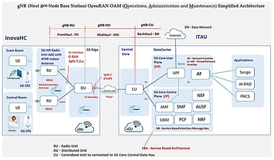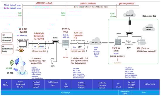 We have requested of Anatel, the Brazilian telecommunications regulator, the use of the radio frequency spectrum by telecommunications systems associated with the Private Limited Service (PLS) for allocating the 5G band of restricted interest for health [1,3,23]. This is meant for exploration nationwide, in the private regime with a frequency spectrum in band n77 5G 3700–3800 MHz, 100 MHz bandwidth with vRAN performing baseband functions as software [3,24].