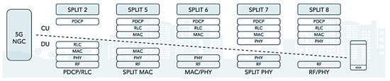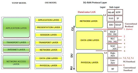 Based on the simplified Radio Protocol Stacks in the comparison of UMTS/LTE/5G Air Interface or datacenter LAN with 4G/LTE/5G RAN network stacks, we will have the “5G NR/NGC SA Protocol Stack” with different technical terms and a functional division“Intra-MAC split” among RU/DU/CU, as shown in layers L1, L2 and L3 and their sublayers in Figure 4 [33].