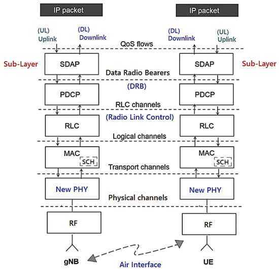 The “5G NR/NGC SA Protocol Framework Stack” is designed to support lower delays and higher data rates with QoS in the sublayers shown in Figure 6 for UE and 5G gNB base station with DL or UL directions of data packets [37].