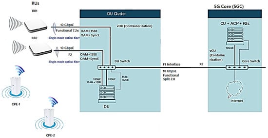 - The DU/vDU of the gNB-DU (Midhaul) of the distribution unit (DU) mounted on a COTS server with docker system for vDU containerization;