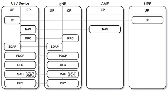 Radio protocol stack simplified in the UMTS/LTE/5G air interface or datacenter LAN with 4G/LTE/5G RAN Network stacks—Comparison to have the “5G NR/NGC SA Protocol Stack”. Based on [32,33,34,35,36].