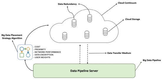 Moving to and hosting big data on the cloud shifts the extra overhead of data redundancy, backup, scalability, security, etc., to the cloud service provider [6]; however, it could be expensive given the scale of data volume [5]. Therefore, principles and algorithms, including the spatiotemporal patterns of data consumption, need to be created to establish the data’s analytical value and its preservation by balancing the expense of storage and data transfer with the quick accumulation of big data [7]. In addition, the pace of big data necessitates the storage systems to scale up fast, which is challenging to achieve with standard storage systems. That is why it is important to either select a suitable storage facility before data placement or move the compute step closer to the data during data processing. In this respect, the objective of this article is to demonstrate that the integration of StaaS with big data pipelines is a promising direction. This necessitates a one-of-a-kind solution for data pipeline design and a method for real-time data placement that takes into account constraints such as unknown data volumes, availability, location, data security, etc. To this end, we first propose an approach to realize big data pipelines with hybrid infrastructure, i.e., computation on an on-premise server or on a specific cloud, but integration with StaaS; and secondly develop a ranking method for predeployment stage to find the most suitable storage facility, dynamically, based on the user’s requirements, including cost, proximity, network performance, server-side encryption, and user weights (i.e., preferences) [8,9]. Figure 1 demonstrates the solution approach on a multicloud environment, i.e., cloud continuum, where storage and computation could be distributed over multiple cloud providers, and a cloud storage provider could be selected dynamically based on the aforementioned parameters. Several evaluations were carried out to demonstrate the effectiveness of the proposed approach in terms of data transfer performance, the utility of the individual parameters, and the feasibility of dynamic selection of a storage option based on four primary user scenarios, including scenarios covering temporary requirements, high variable workloads, high-security and low-scale solutions, and dormant workflows.