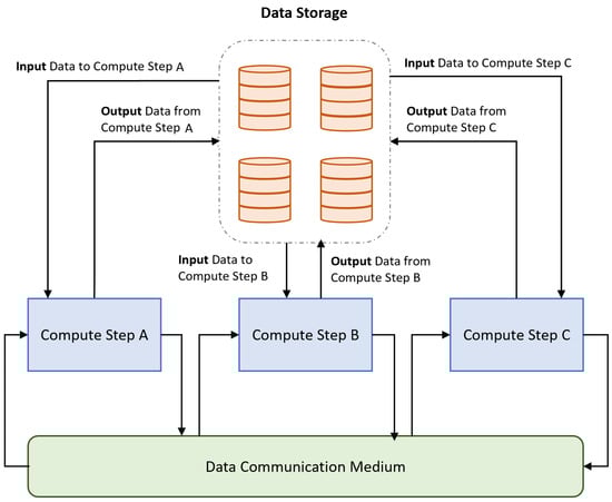 A data pipeline is composed of atomic units, called steps, applied to data (e.g., cleaning, enriching, and transforming) [17,18]. Using a basic generalization, each step receives data as input from a data store and processes it before pushing the outputs back to a data storage. Processed data travel over the computer network using the data transmission medium. The inputs and outputs of a step are coupled to such channels. The results of one stage must be used as input for the following step in the pipeline. Control messages, such as notifications and triggers for the other steps, are also passed through the communication medium. Some common examples include KubeMQ, ZeroMQ, etc. An example data pipeline architecture is depicted in Figure 2. An example pipeline could include processing data from multiple streams that are gathered and stored by a cloud storage provider. A data transfer medium is set up between the cloud storage and the data pipeline server. For data transfer, the HTTP or FTP protocols could be used. For this experiment, we used the standard HTTP protocol. A message queue is implemented on the data pipeline server for interstep communication. The integration can either be performed with single cloud storage or multiple cloud storage. For example, it is possible to store data collected from various streams in the storage facility offered by a storage provider, but the data after processing could be stored with another cloud storage provider.