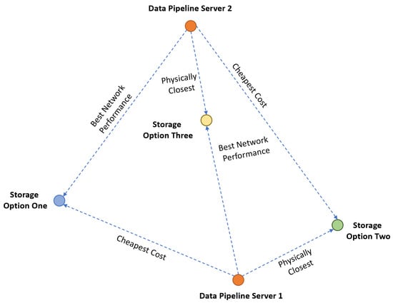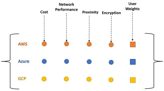 There are several parameters that affect the choice of cloud storage, such as the cost of storage space, security, performance, and location. Cloud providers come with a variety of storage, computation, and network resources; therefore, in order to make an informed choice, multiple parameters need to be taken into account. In this study, five primary parameters were selected for the evaluation of different cloud storage providers, which are (1) cost, (2) proximity, (3) network performance, (4) impact of server-side encryption, and (5) user weights/preferences. Cost is one of the major reasons for application providers to move their services to the cloud [4] and is a complex construct. Proximity, or distance in this context, is selected since it has a direct impact on communication latency. Proximity can provide an indication of which facility is likely to provide the best data transfer performance; however, the actual network performance tests (bandwidth, throughput, latency, etc.) can provide further information, while noting that the proximity is a more permanent characteristic than the network’s performance. The fourth parameter is the impact of server-side encryption for the sake of data security, which is a strong concern for the adoption of cloud solutions [40]. Finally, user preferences are used to allow decision-makers or users to communicate their preferences. These parameters are interdependent on each other; therefore, there is a possibility that the cloud service provider that fulfills security requirements does not have the best network performance, or that the one closest to the data pipeline server is more expensive. This scenario is visually represented in Figure 4. The focus of the proposed method is mainly on data locality, that is, smart data placement to achieve maximum performance output; however, different locations with different cloud storage providers have different costs. In addition to that, all data centers have different network infrastructures, so network performance can vary between different data centers. The challenge is to decide which criteria are best suited to the situation and user requirements. In the following, we discuss the first four parameters in detail, and the last one is discussed as part of the ranking method.