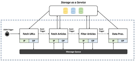 The example pipeline used in the performance evaluation is depicted in Figure 6. The dataset used in the experiments is articles from different online blogs and news websites, each occupying a few kilobytes (KBs) of space on a disk. The use of bigger data chunks is avoided to increase the number of disk operations, which also means less use of computing power. The first step of the data pipeline fetches the URLs from the storage and checks if they are valid. After completing the operation, a flag is set against each URL. The second step downloads only the validated URLs from the storage, then fetches articles from each online source and stores them in the database. The third step downloads the articles from the storage, strips HTML and Javascript tags from the text, and then stores them back in the storage. The fourth step downloads the cleaned text and splits it into smaller data chunks. Since the experiment was to study the role and impact of cloud storage in big data pipelines, to make sure the results are a true representation of the role of StaaS in the performance of a big data pipeline, simple textual data are used so that the least amount of time is spent on actual processing of the data. This way, the execution time of the data pipeline reflects the more precise role of the storage service being used.