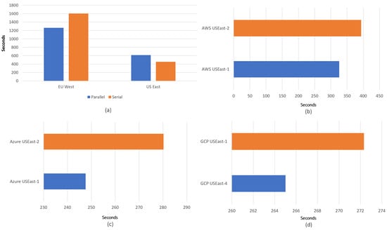 The results of performance experiments: (a) Parallel vs. serial execution using the region suggested by our approach for AWS; (b–d) region pair comparisons in parallel execution for all providers using region suggested by our approach and best guess region.