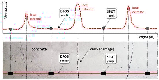 The solution to this problem is proposed by distributed fibre optic sensing (DFOS), which, in contrast to spot gauges, allows the measurements to be performed continuously over the structural length (Figure 1). Therefore, there is no way to omit any extreme values, so one of the main goals of structural health monitoring—direct damage detection and its size estimation—can finally be fulfilled.