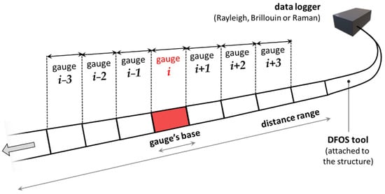 Currently, there are three main optical phenomena utilising the concept of distributed sensing: Rayleigh, Brillouin, and Raman scatterings. They have found their way into the design of optical data loggers available on the market. Each of them produces several DFOS sub-techniques characterised by individual advantages and limitations related to measurement parameters [,]. These are the type of the measurand, distance range, spatial resolution, accuracy, repeatability, measurand’s resolution, measurand’s maximum range, optical budget, acquisition time, operating temperature, and more. Spatial resolution is one of the critical parameters which could be understood, in simple terms, as the number of gauges per unit length of the DFOS tool. This can be visualised as a chain of spot strain gauges connected in series, in which the bases are adjacent (the end of one is the start of the next) (Figure 2).