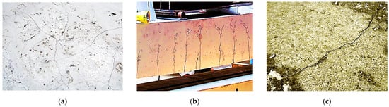 (a) Irregular thermal-shrinkage cracks within the surface of the slab; (b) multiple cracks within the tension zone of the bent beam; (c) single crack in the concrete road.