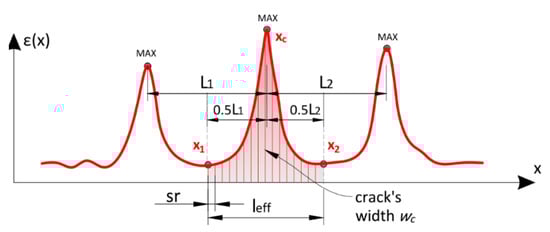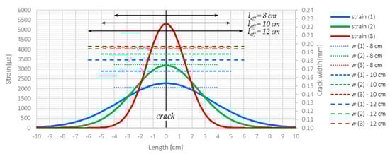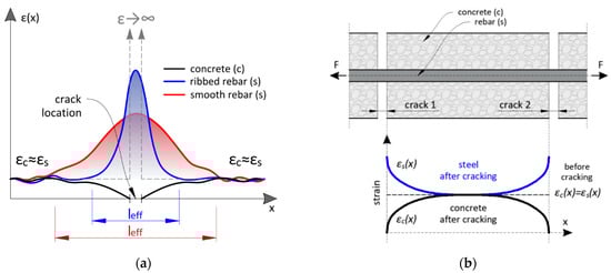 Local discontinuities cause theoretical strains to tend to infinity within this area. The concrete disappears within the crack, influencing the strain profiles in reinforcing bars passing through the crack. By assuming the ideal bonding between these two materials, the rebar should also be broken, but this is not happening. The reason for that is debonding over some distance around the crack, called further the effective length leff. This length depends on the material properties (both concrete and steel rebars) and bonding properties at the contact surface. For the rebars with the smooth outer surface, the crack-induced strain peak value will be lower, while leff will be longer. On the other hand, the peak will be higher for ribbed rebar, while the leff shorter (Figure 4a). By assuming that the cracks’ spacing is longer than the effective length, concrete and steel strains should be equal in the areas between the cracks (Figure 4b). In practice, cracks’ spacing depends on the strength and elasticity of concrete, static and loading scheme, boundary conditions, diameters, arrangement of the reinforcing bars inside the concrete, and many other factors.