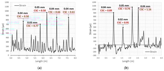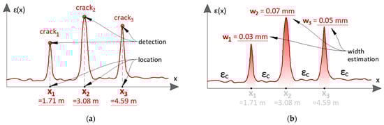 The main goals of distributed sensing for cracked concrete assessment are summarised in Figure 5. Firstly, the detection of cracks must be possible. In other words, the crack-induced strain peaks must be sharp enough to identify the crack presence clearly. Next, based on the installation documentation, the locations of cracks must be specified in relation to the structure’s geometry. These two steps are further called qualitative analysis (Figure 5a). On the other side, we have the quantitative analysis to estimate the cracks’ widths with sufficient accuracy, meaning better than 0.05 mm from an engineering point of view (Figure 5b). In cases of non-cracked concrete (e.g., with regard to prestressed structures) or when the crack spacing is greater than leff, the sensor’s task is to reflect the actual structural strains accurately. However, it must be underlined that within the debonding area, this goal is transformed into the correct detection and estimation of the damage size instead of analysing the concrete deformations as a continuous material.