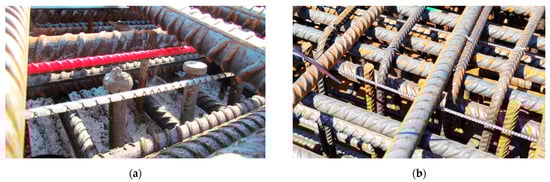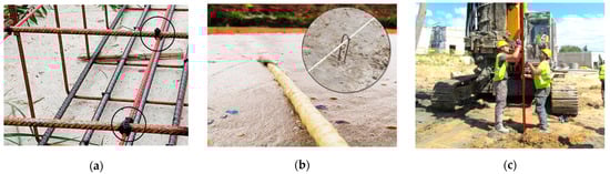 When a structural element is reinforced, which is the most common situation in civil engineering projects, the DFOS tools can be tied to the rebars using cable ties (Figure 6a). Usually, sensors are cut at the required length, delivered on-site in coils, unrolled and stabilised in designed positions. However, the applications are not limited only to reinforced elements. Figure 6b presents an example of the foamed concrete layer within the road structure, where DFOS tools were installed using special mounting brackets. Another case in point concerns concrete columns, where a special installation procedure was elaborated and applied in order to embed the sensors []. A steel tube with the sensors ended with an anchor was pressed into the concrete; the anchor was then relieved, and the tube was pulled outwards, leaving the sensor inside.