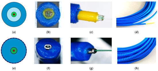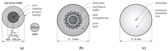 Although the systematic, safe handling of the fibres in their primary coatings on site is not feasible due to the high failure risk, they are the in-built measuring elements in other DFOS tools. These are layered cables and monolithic sensors widely used in civil engineering [,] and geotechnical [] applications, including bridges [], roads [], collectors [], pipelines [,], and many others. A brief summary of each of these two different concepts is presented in the following subsections.